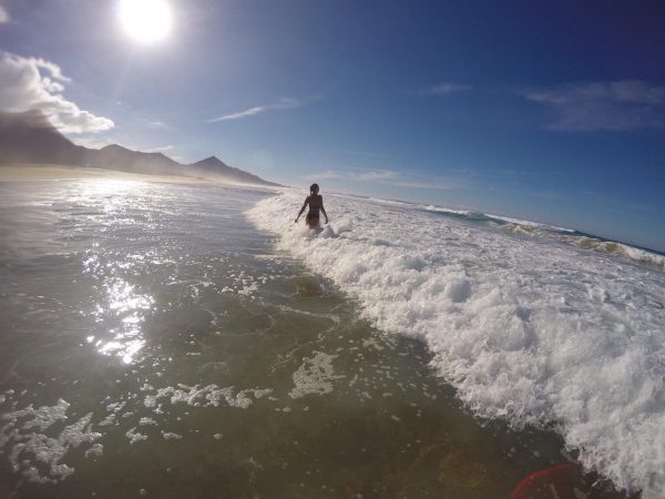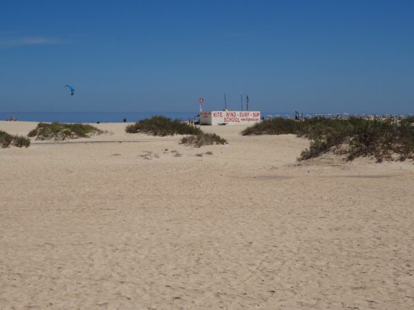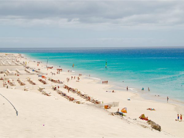 "Playa de Sotavento", which is 5 km long, is situated on the southern east coast of Fuerteventura. Every year, windsurfing and kite boarding world championships take place here. Playa de Sotavento is ideal for both surfing and kite boarding beginners and masters. The beach is too windy for relaxed bathing but you can lie down in the protected small dunes that are covered with vegetation. You can also do naturism and the beach is suitable for children since the water is very shallow.